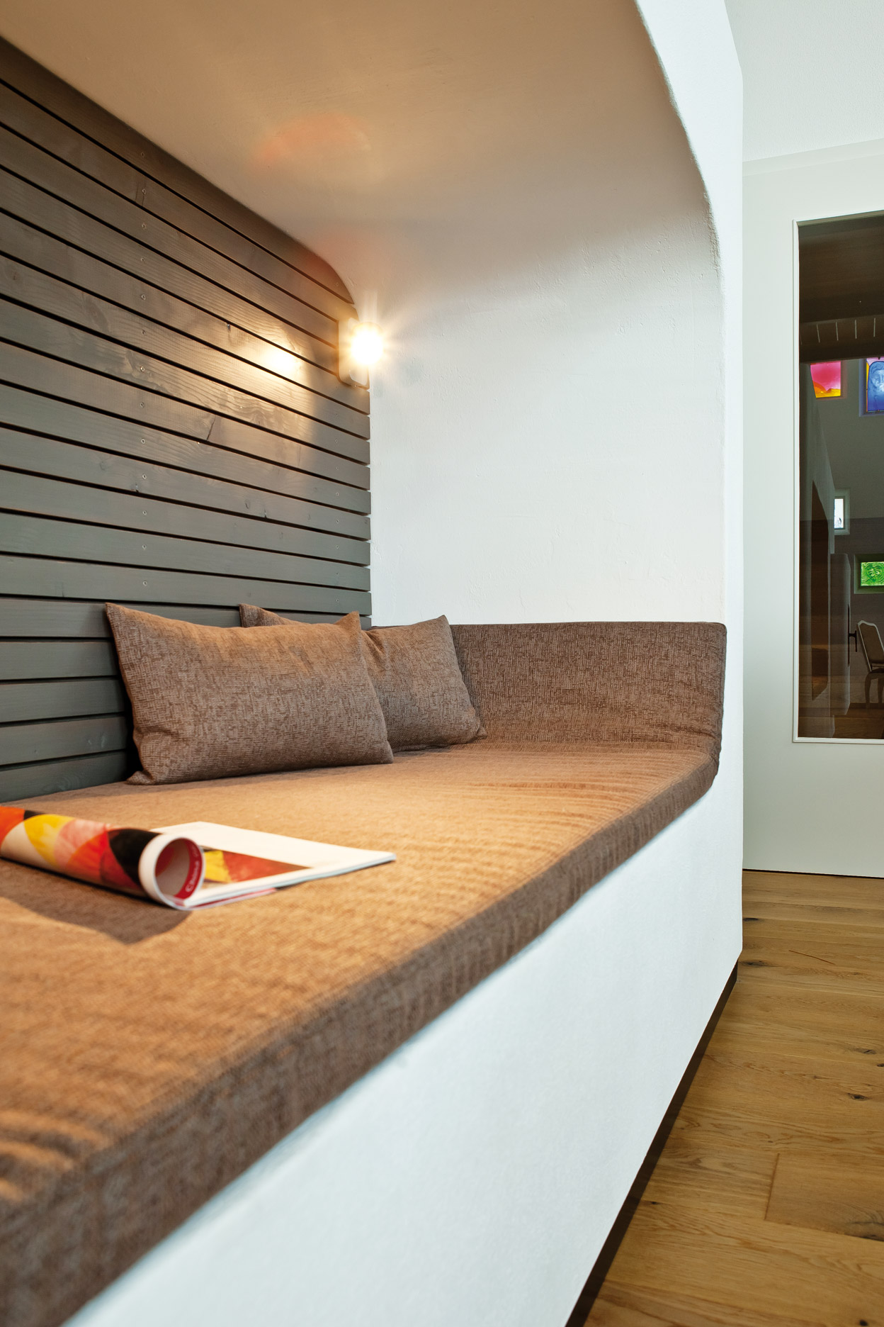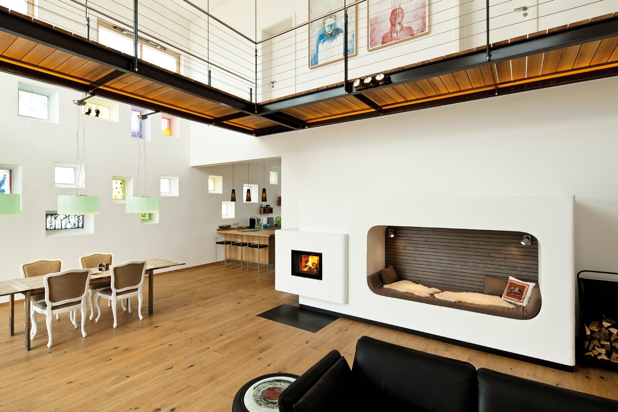 DER SPEZIELL FÜR DAS PAAR ANGEFERTIGTE OFEN MIT DEN ABMESSUNGEN 380 X 170 X 90 ZENTIMETER FÜGT SICH HARMONISCH IN DEN OFFENEN WOHNRAUM EIN. HIGHLIGHT: DIE INTEGRIERTE LESEHÖHLE.
