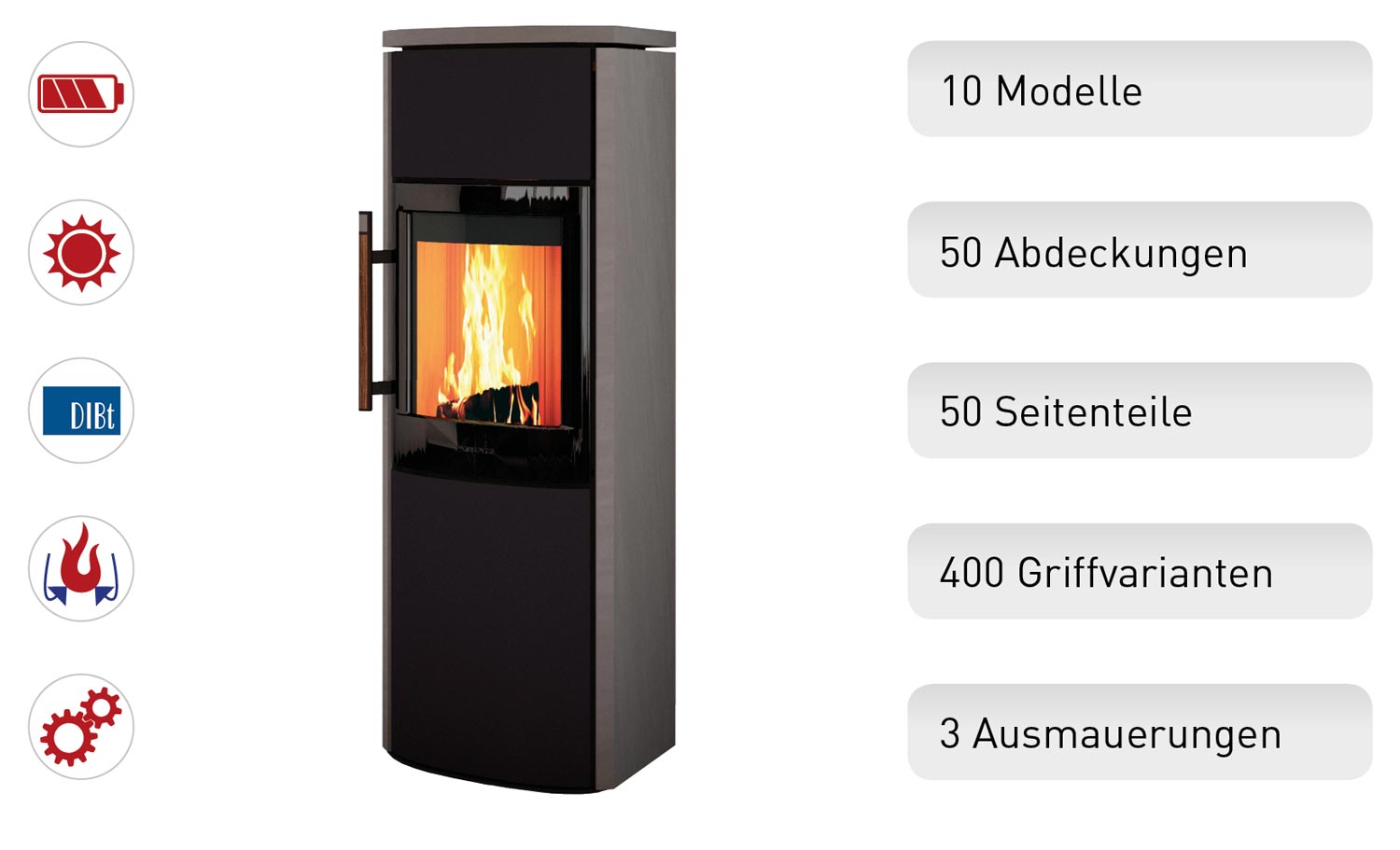Kombiniere hochwertigste Verbrennungstechnik mit verschiedenen einzigartigen Materialien aus Naturstein, Keramik oder Edelmetall. Für Topplatte, Seitenteile, Griff und Ausmauerung kannst Du diese Materialien frei wählen und miteinander kombinieren. So kannst Du aus über 1 Million Möglichkeiten Deinen ganz persönlichen, individuellen VAIO Kaminofen erschaffen.