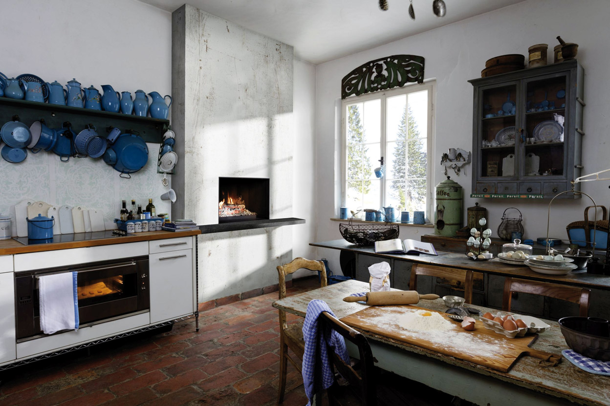 Die Urfeuer-Kamine sind in acht verschiedenen Formaten erhältlich, darunter als Eckund Panoramakamin sowie – als individuelle Variante – als offener Küchenkamin. Damit lassen sich, wie früher, Speisen über dem Holzfeuer zubereiten. Und was strahlt mehr Gemütlichkeit aus, als den Braten langsam und gediegen am Spieß im Kamin garen zu lassen – vor den Augen der Familie oder der Gäste? Das „Urfeuer“ als Entschleuniger in einer hektischen Zeit. Die Spießachse ist optimal zum Feuer positioniert, sodass Lammkeule, Roastbeef und Co. garantiert immer gelingen. Die Grillgerüche werden über den Schornstein abgeführt; der Dunstabzug ist bereits integriert. Perfekt eingebaut ist der Küchenkamin in Arbeitshöhe mit einer vorgesetzten Ablagefläche. So verleiht das „Urfeuer“ auch modernen, puristischen Küchen Behaglichkeit und Atmosphäre.