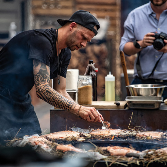 Vollständige Verköstigung allein mit Feuerring – ist das denn machbar? Chris Züger stellte dies schon 2016 an der Olympiade in Rio de Janeiro unter Beweis: dort grillte er im „House of Switzerland“ mit Feuerringen und verwöhnte tausende von Besuchern kulinarisch. Mit seiner Firma Lust auf Mehr GmbH bereitet Züger inzwischen für 10 oder 300 Personen ein komplettes Menu auf und mit den Feuerringen zu. Nichts ist dabei vorgegart, man arbeitet ohne Strom und ist bezüglich der Produktauswahl überhaupt nicht eingeschränkt.