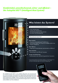 Aus diesen wissenschaftlich fundierten Erkenntnissen ging der weltweit erste digitalgesteuerte Ofen von HWAM hervor, der den gesamten Heizvorgang elektronisch überwacht: Der AutopilotIHS. Die Luftzufuhr über drei unabhängige Lufteinlässe wird mittels einer Software reguliert. Basis hierfür bilden die Messungen der Raum- und Ofentemperatur sowie der Sauerstoffkonzentration in den Abgasen. Ein großes Problem beim manuellen Heizen lag bisher im Erkennen, ob genügend Sauerstoff vorhanden oder die Temperatur hoch genug ist – diesübernimmt nun der Autopilot IHS automatisch. Der Kaminofenbesitzer stellt lediglich die gewünschte Temperatur auf der dazugehörigen Fernbedienung ein und wird benachrichtigt, wenn er ein neues Holzscheit nachlegen muss.