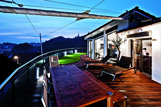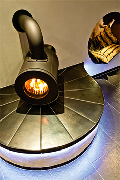 Die Lösung beschreibt Andreas Zapfe rückblickend als „Schnapsidee… Dann müssen wir halt einen Spiegel einbauen. Gesagt getan.“ Entstanden ist so ein Feuermöbel mit freistehendem. um 360 Grad drehbaren Tunneleinsatz, der sowohl von der Couch, als auch im warmen Ofennest sichtbar ist. Lautsprecher und ein stimmungsvolles Beleuchtungskonzept runden das Wellnessgefühl ab.