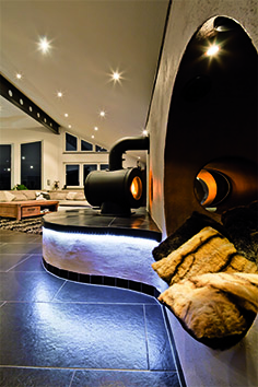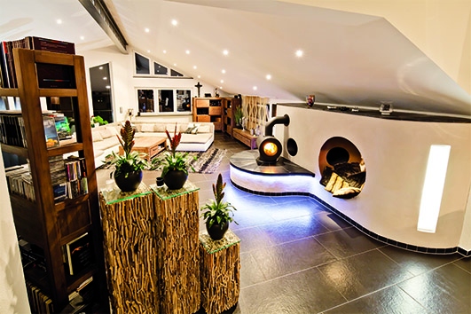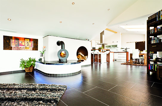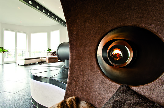 Das Ziel hatten Anton Nothofer und Alexandra Grabler schon beim ersten Treffen mit Ofenbauer Andreas Zapfe definiert: Am warmen Ofen sitzen und in das Feuer blicken, egal wo man sich auch gerade befindet. Das Flammenspiel musste sich außerdem zu einem Highlight der Penthousewohnung drehen lassen: einem runden Kuschelnest ausgelegt mit bequemen Kissen und Decken. Ein echter Wohlfühlplatz im ansonsten hektischen Alltag der beiden. Nichts anderes sollte es sein. Allerdings war der Grundriss des gewählten Ofens für die Wohnsituation und die Wünsche der beiden eher ungeeignet. Das Kuschelnest durch eine konkave Rundung der Anlage herauszudrehen um dann so ins Feuer blicken zu können, hätte den Hauptkorpus in dem alles untergebracht war unnötig vertieft und das ansonsten offene Wohnambiente zu stark beeinträchtigt.