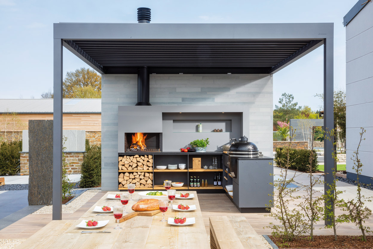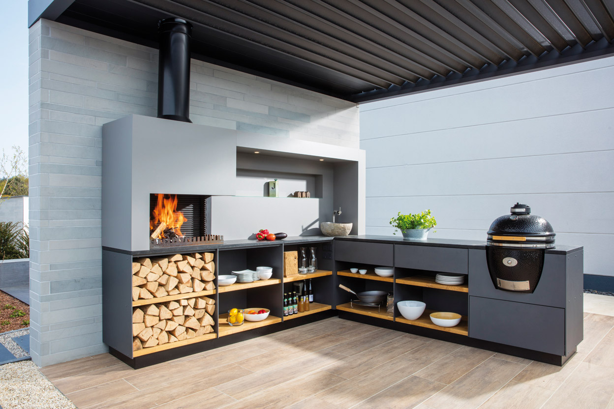 Die Freiluftküche holt das Drinnen kurzerhand nach Draußen. Denn was gibt es Schöneres, als unter freiem Himmel zu grillen und zu essen? Dank des modularen Charakters kann die Küche nach Lust und Laune erweitert werden – über 60 verschiedene Varianten sind möglich. Grundstein ist immer eine vollwertige Küche mit Spülbecken, Schubläden, Türen, Mülltrennsystem, Elektroanschlüssen und Beleuchtung. Dabei setzen die Hersteller auf wetterfeste Materialien: Korpus aus 8 Millimeter dickem Aluminium, pulverbeschichtet, Edelstahlschornstein und massive Granitarbeitsplatte. Absolutes Plus: Das Grillmodul ist mit einem keramischen Kugelgrill ausgestattet (Monolith classic), der viele verschiedene Garmethoden wie Grillen, Backen, Dörren oder Räuchern ermöglicht. VON OFENRAT.