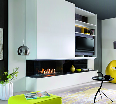 Bei der Serie der gasbetriebenen Feuerstellen ECO-prestige ermöglicht der Einsatz eines zusätzlichen Gasbrenners in den Keramikholzscheiten, die Flammenhöhe zu verdoppeln und so ein Flammenschauspiel anzubieten, das sich den einzigartigen Dimensionen der Panoramascheibe bestens anpasst. Außerdem kann der Effekt des lodernden Holzfeuers optional durch ein glimmendes LED-Glutbett ergänzt werden. Die rahmenlose Sichtscheibe gewährt großzügigen