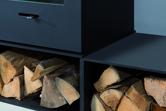 Der Elm verfügt über ein Standardkamingestell – vier stählerne Füße, Original genannt , kann jedoch auch auf eine bereits vorhandene Bodenplatte oder eine Storage Base platziert werden. Die Storage Base wurde speziell für die Holzlagerung entwickelt und ist in zwei Größen erhältlich. Die Elemente passen sowohl unter als auch neben den Ofen, und können außer zur Holzlagerung auch zu anderen Zwecken verwendet werden. Wie man auf unserem Bild sieht, gibt es viele Möglichkeiten. Mit dem Elm holen Sie sich Design ins Haus, das nicht nur Wärme und Atmosphäre schafft, sondern auch einen Gewinn für Ihre Einrichtung darstellt.