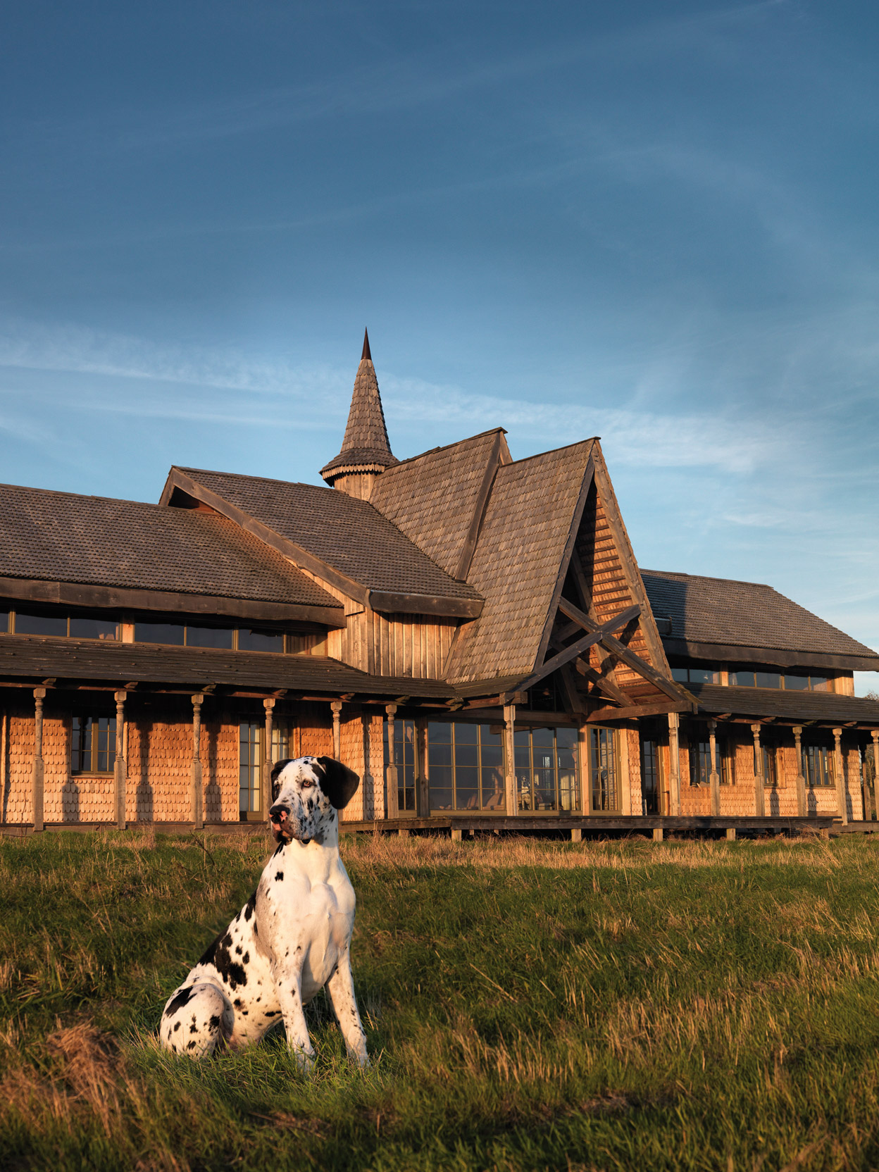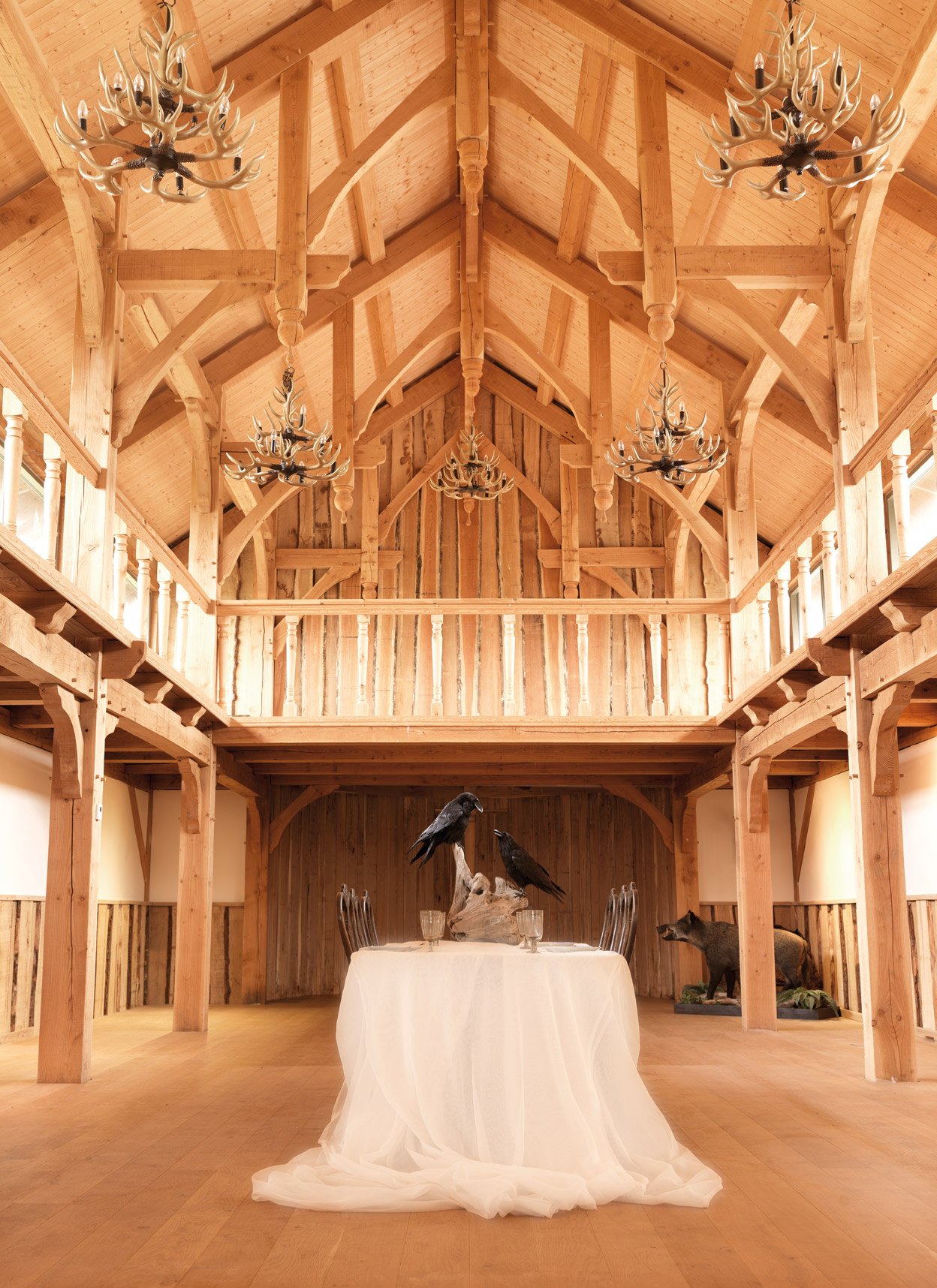 Das Ergebnis, das nach vielen Zeichnungen und Überlegungen entstand, ist wahrlich einzigartig und nahezu majestätisch: Neun Meter hohe Decken, steile kathedralische Giebel, feinste Holzverzierungen, viel Liebe zum Detail und ein Hauch gotischen Einflusses empfangen Lyngvild, Morten und ihre beiden Dänischen Doggen Ask und Eik (übersetzt bedeuten diese Namen übrigens Esche und Eiche) jeden Tag aufs Neue. Mittelpunkt und Zentrum des Lebens im Haus ist das 100 Quadratmeter große Wohnzimmer. Es ist von oben bis unten in Holz gehalten, überrascht mit etlichen dekorativen Highlights wie Tierfellen, Hirschgeweihen sowie altertümlichen Truhen und beherbergt vor allen Dingen den wärmespendenden Ofen.